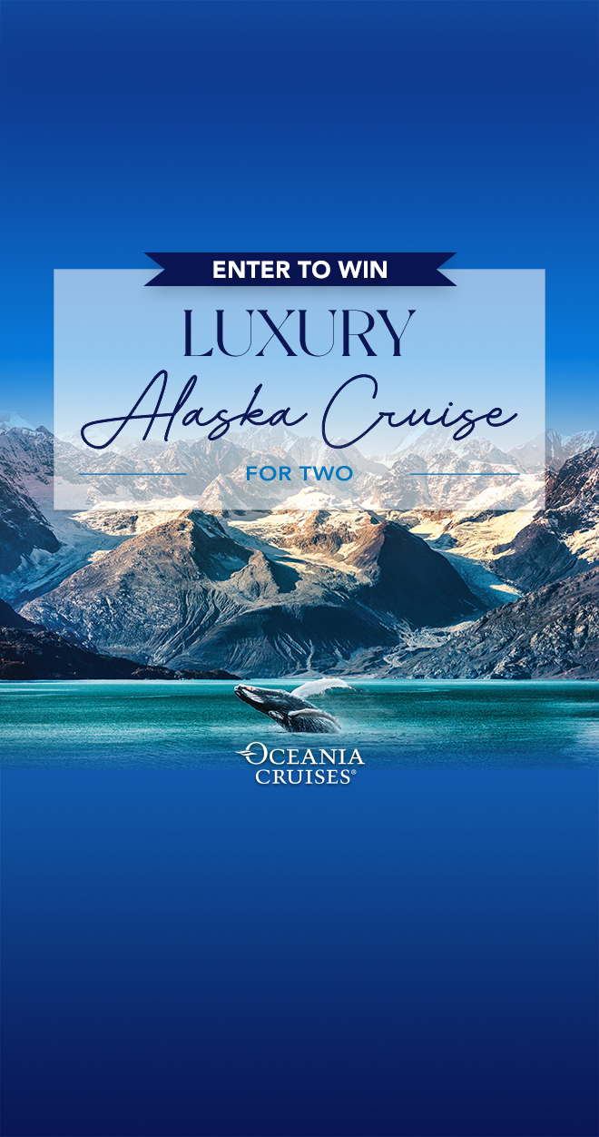 ONE (1) PRIZE: The prize consists of an Alaskan cruise for two (2) aboard the Oceania Riviera, departing in 2026. Accommodations are in a Veranda Stateroom – Category B. This cruise-only prize does not include airfare. The voyage includes Oceania Cruises' Your World Included amenities: gourmet specialty dining, unlimited Starlink® Wi-Fi, shipboard gratuities, in-suite and in-stateroom dining, sodas, specialty coffees and teas, still and sparkling water, group fitness classes, and laundry services. The prize is non-transferable and must be claimed and booked by December 1, 2025, for select sailings departing within 2026. The prize is valid for the winner's choice of one of three Oceania Riviera sailings, departing May 25, June 4, or June 13, 2026. It is valid only for the winner and cannot be transferred, sold, or redeemed for cash. Subject to availability. Additional terms and conditions may apply.